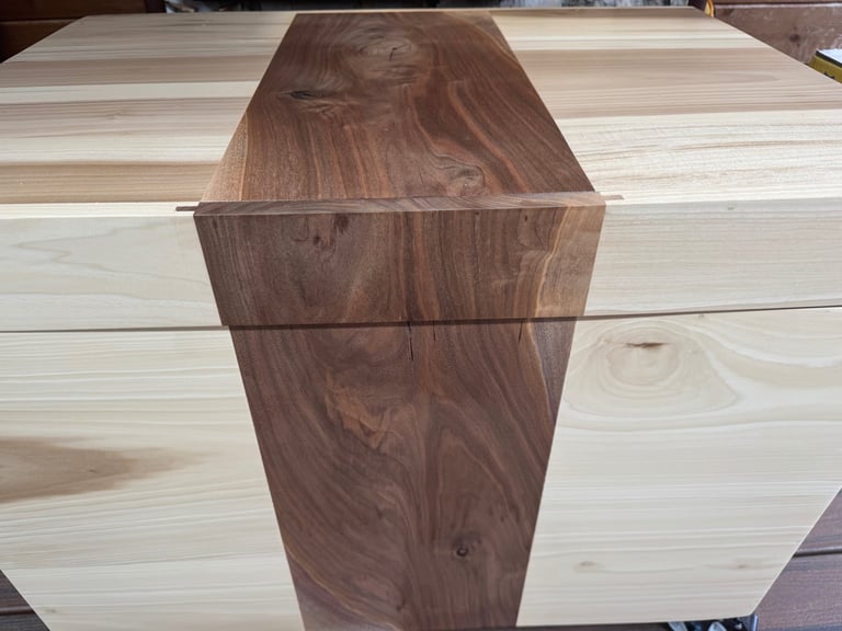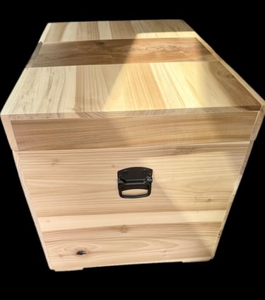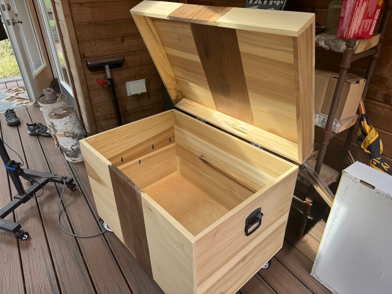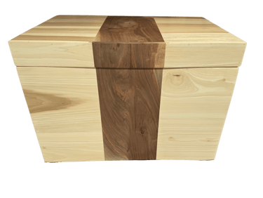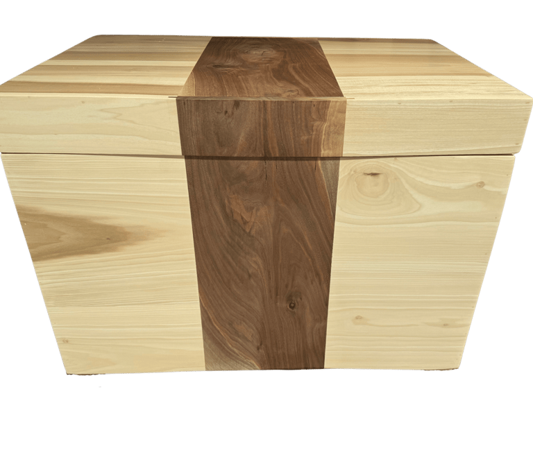 The name Walnut Waterfall is inspired by the natural walnut grain that flows seamlessly from the lid down the face of the trunk — a continuous “waterfall” pattern that evokes the elegant rhythm of a canter line. Built from real hardwood rather than plywood or veneer, it offers heirloom longevity and the warm, organic feel that only solid wood can provide.